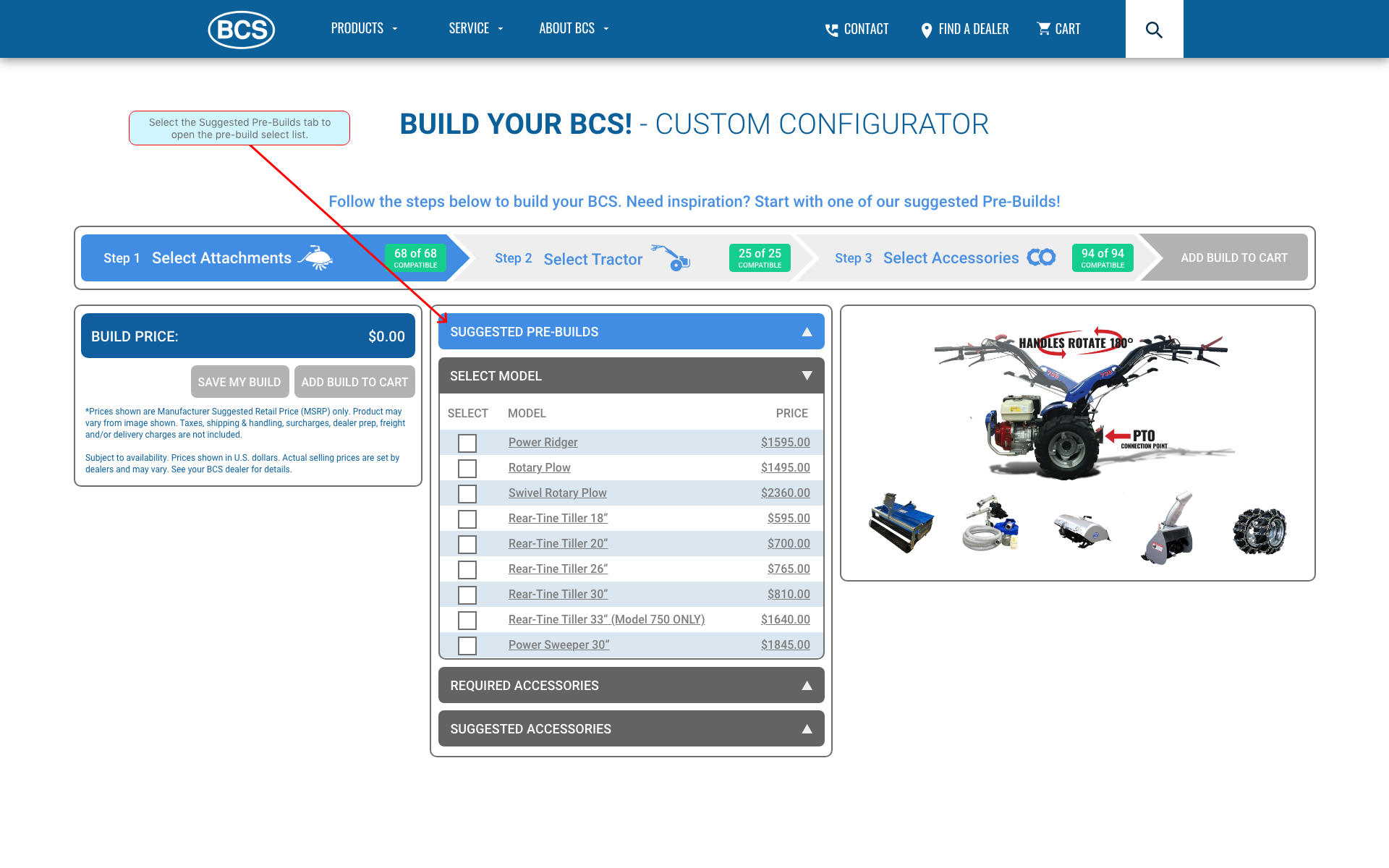 Build-Your-BCS configurator – Lets prospects assemble a tractor package and save it for follow-up, while dealers can duplicate the build and add local fees. bcsamerica.com